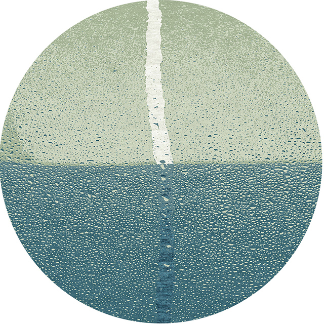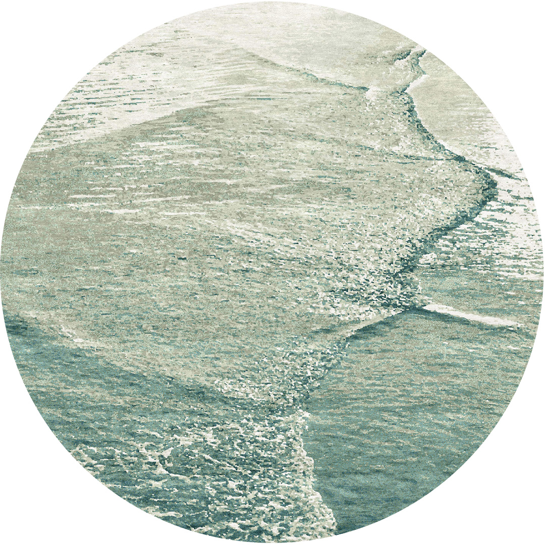 Custom coloured green and teal version of our London design in a round rug. Based on a single drop of condensation snaking its way down a window pane, our London rug is intricately hand knotted in wool and silk.