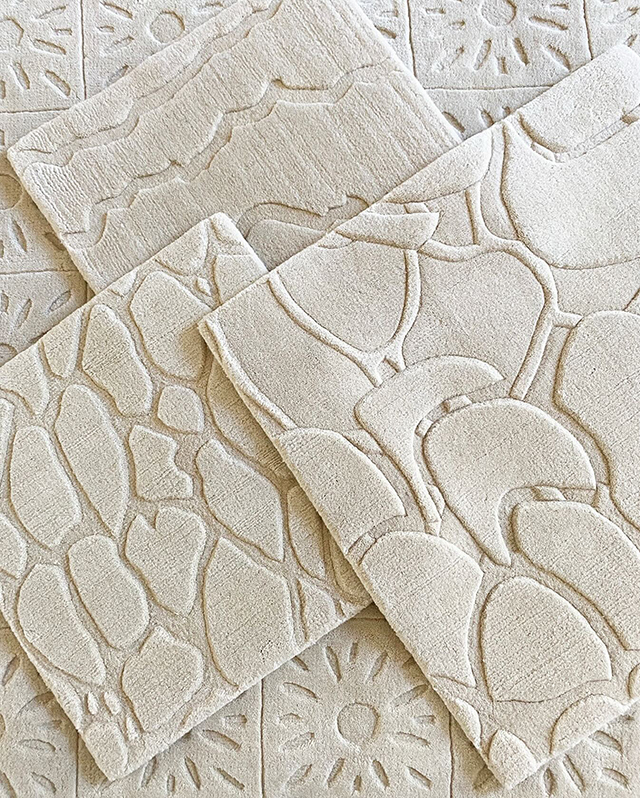 Some samples in our handloom carved quality. Plain woven on a handloom, the designs are then cut and carved in different pile heights by hand creating textural and sumptuous rugs.