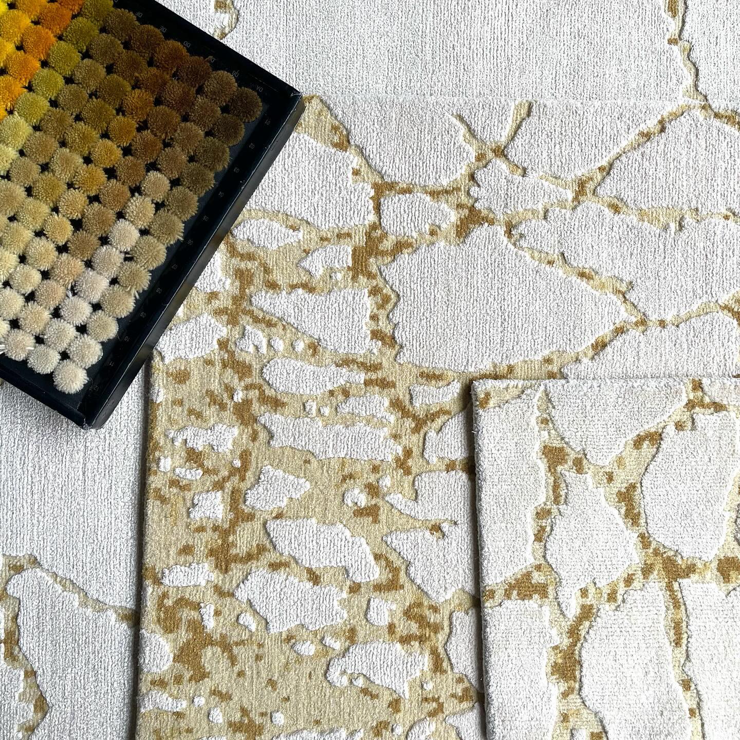 Silk is shining on our samples and colour poms in the new Boudha design. Hand knotted in wool and silk, we can weave our Boudha rug in any size, shape or colour.